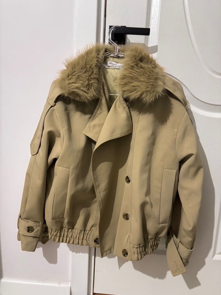 Sentetik kumaştan yapılmış, kürklü detaylı bej renkli, normal uzunlukta ve dar kesim midi kadın ceketi, dış mekan için uygundur.