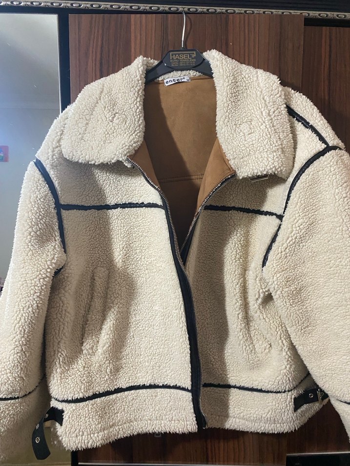 Uzun kollu, bej renkli, kürk detaylı ve rahat kesimli midi kadın ceket, sokak stiline uygun sıcak dokuda.