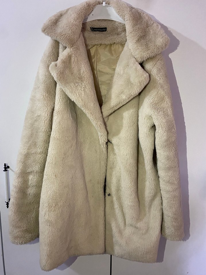 Bej renkte, kürk detaylı, yumuşak ve sıcak kumaştan üretilmiş kadın kabanı. Çentikli yaka, uzun kollu ve bol kesim midi boydadır.