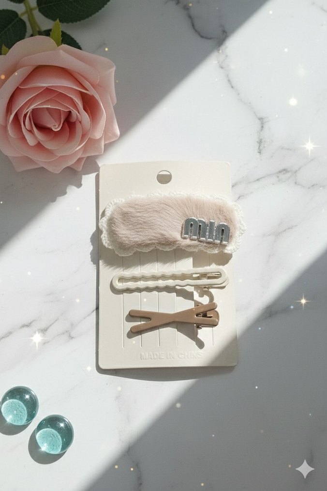 Pastel bej renkte, kürklü ve nakış detaylı toka ile uyumlu sade tasarımlardan oluşan çocuk saç tokası seti.