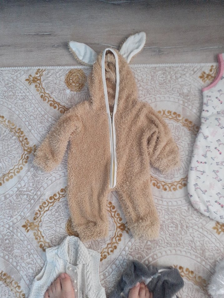 Yumuşak ve sıcak kumaştan yapılmış, kürklü detaylı bej renkli bebek tulumu, kulaklı kapüşon ile tamamlanmıştır. erkek kiz bebek ikisinede olur