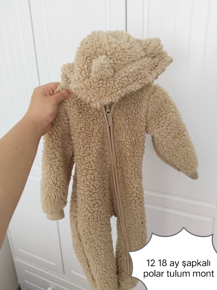 Bej renkli, yumuşak ve sıcak kumaştan yapılmış, kürklü detaylı kapüşonlu erkek bebek tulumu. Ön fermuarı ile kolay giyilir.