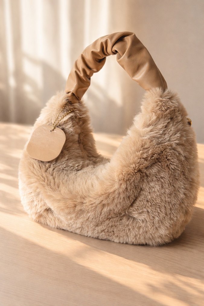 SIFIR ÜRÜN, sağlam, kaliteli, defosuz✨ • Model Tipi: Mini omuz çantası / elde taşınabilir çanta • Malzeme: Yumuşak dokulu peluş (kürk görünümlü kumaş) • Renk: Bej – krem tonlarında, sade ve şık✨ • Sap: Büzgülü, deri görünümlü kısa sap