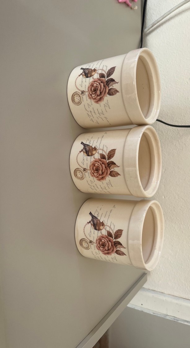 Bej renkte, kuş ve gül desenleriyle süslenmiş seramik mutfak kavanozlarıdır. Mutfak dekoruna nostaljik bir hava katar. ️
