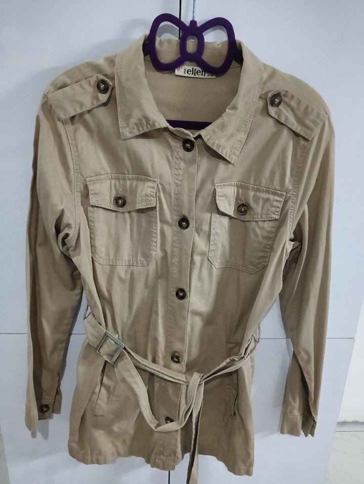 Bej renkte, kuşaklı kadın ceket. Uzun kollu, kesik yaka ve bol kesim. Yumuşak süet kumaştan, günlük sokak stiline uygun midi boyda.