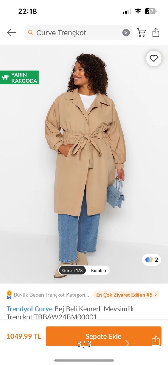 Bej renkli, kot kumaştan yapılmış, kuşaklı ve geniş kesimli kadın trençkotu. Notlu yaka ve uzun kollu, günlük rahat sokak stili için uygundur. Çok az giydim. Kilo verdiğim için olmuyor