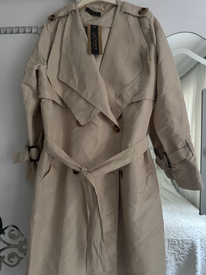 Marka temsilidir. Bej renkli, kuşaklı ve uzun kesim kadın trençkot. İpek gibi kumaştan, geniş kesim ve yakası kesikli. Günlük kullanıma uygun, sade tasarım ve askılı kollarıyla dikkat çekiyor. #kadın #mont #trençkot
