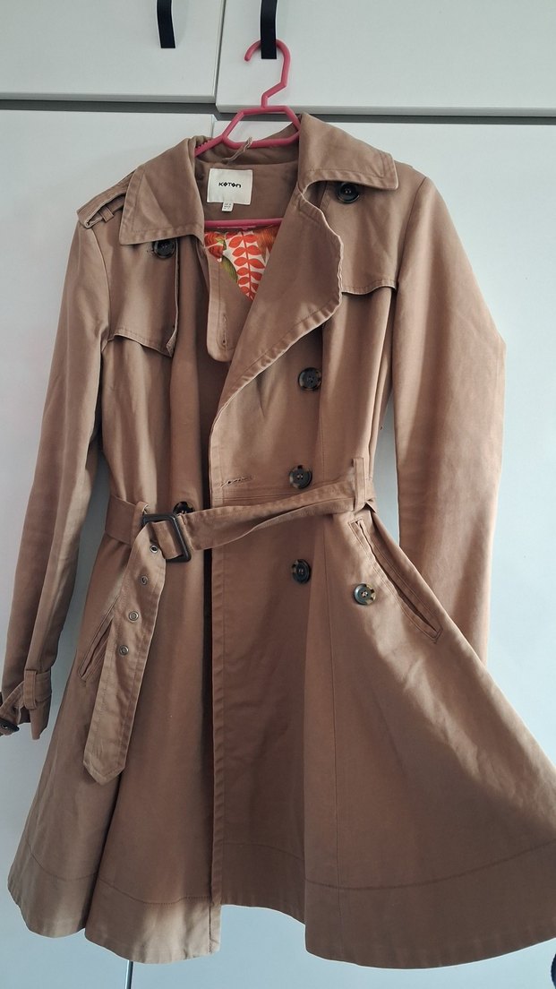 Bej kuşaklı kadın trençkot, normal boyda ve regular kesimdir. Sentetik kumaştan, yakası kesik ve askılı kolludur. Desensiz, şık ve günlük kullanıma uygundur.