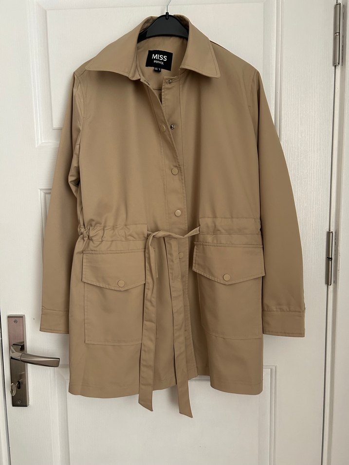 Bej renk, kuşaklı ve bol kesim kadın trençkot. 36 beden yazıyor ama oversize ürün 40 giymeme rağmen bol olduğu için satıyorum. Boyu 78 cm, koltuk altı genişliği 56 cm , etek ucu genişliği 64 cm , omuz genişliği 41 cm.