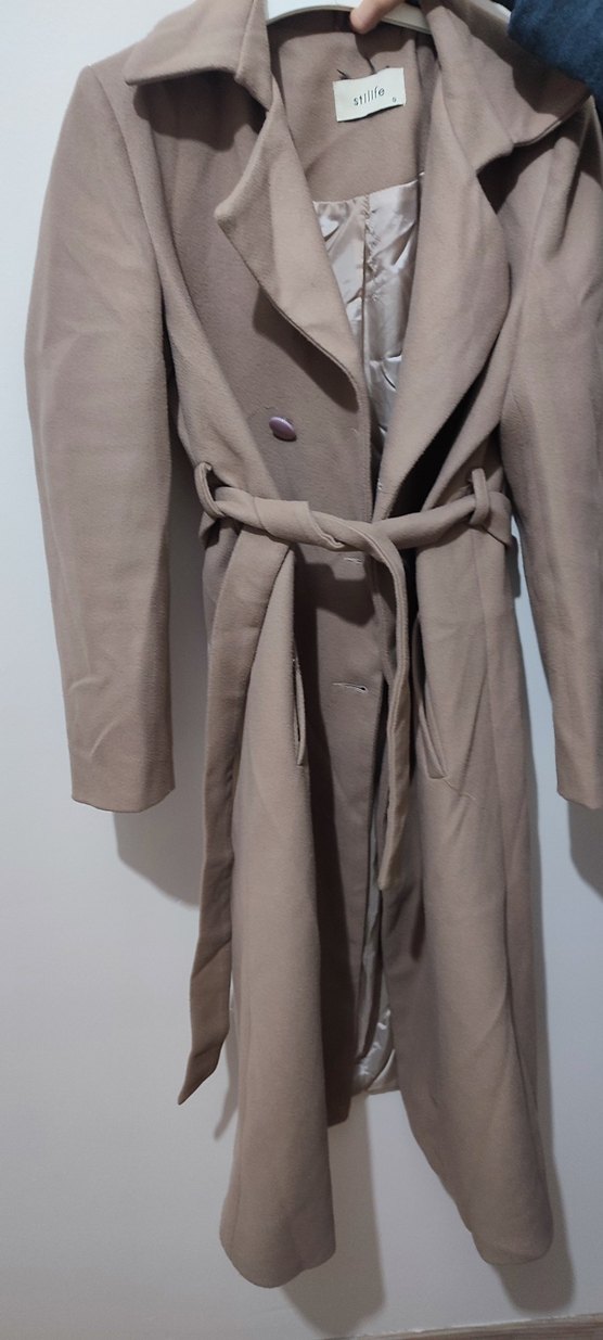 Bej Kuşaklı kaşe kaban etiket s beden fakat m/L uyumlu