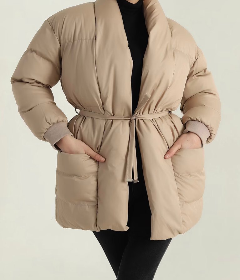 Sadece 38 beden kaldı. Etiketli. Bej renkli, kuşaklı, yüksek yakalı ve bol kesim midi uzunlukta kadın kışlık mont. Yumuşak sentetik kumaştan günlük kullanıma uygun.