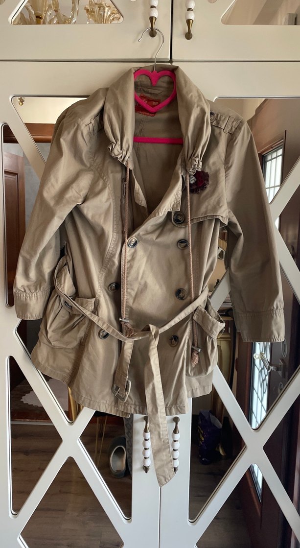 Bej kuşaklı, notched lapel yakalı ve askılı kollu midi trençkot. Sentetik kumaştan, bol kesim ve günlük kullanım için uygun.