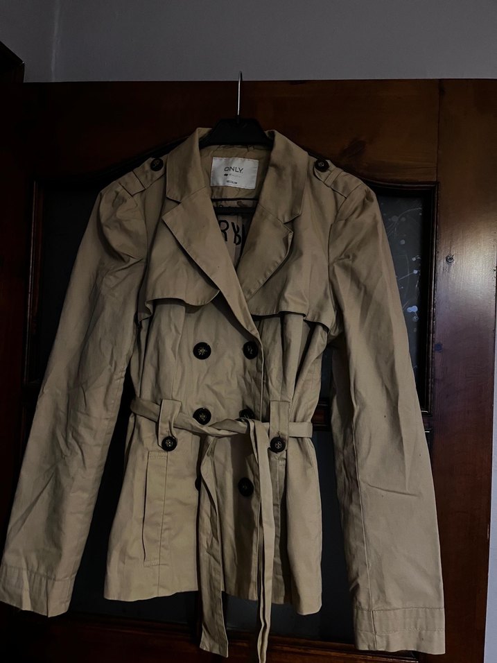 Bej kuşaklı trençkot, notched yaka ve normal kesim. Sentetik kumaştan üretilmiş, askılı kollu ve midi boy, sokak stiline uygun.