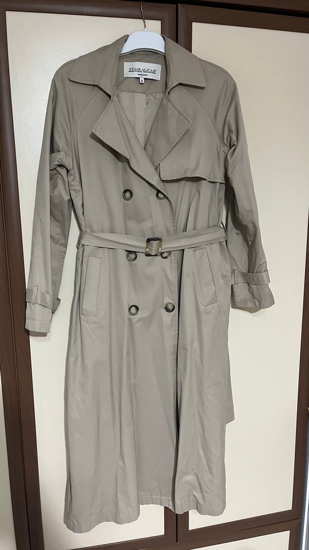 Bej renkte, kuşaklı ve kesik yaka detaylı uzun trençkot. Düz desensiz, sentetik kumaştan, rahat kesim ve uzun kolludur. Boyu 110 cm gogus olcusu 48 cm sayili giyilmiş olmuş temiz sorunsuzdur