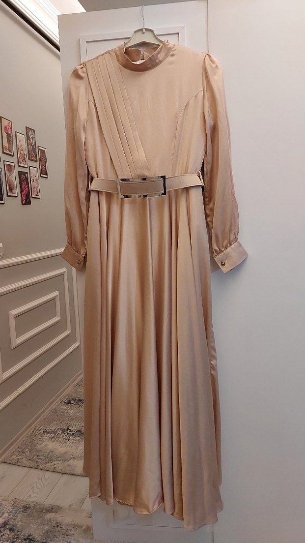 Bej ve sarı renk arası, yakası kapalı ve kuşaklı uzun elbise. Saten dokuda, bol kesim ve sade modern tarzda, düğün özel gün kullanımı için uygun. Boyu yaklaşık 143cm. Kemerden ayarlanabildiği için 36 38 ve 40 bedene uyumludur
