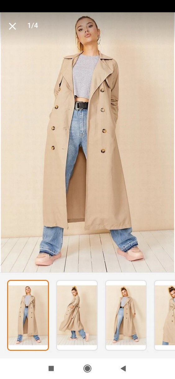 Bej renkli, kuşaklı ve uzun kesim kadın trençkot. kruvaza yaka , rahat kesimli günlük kullanım için uygun.