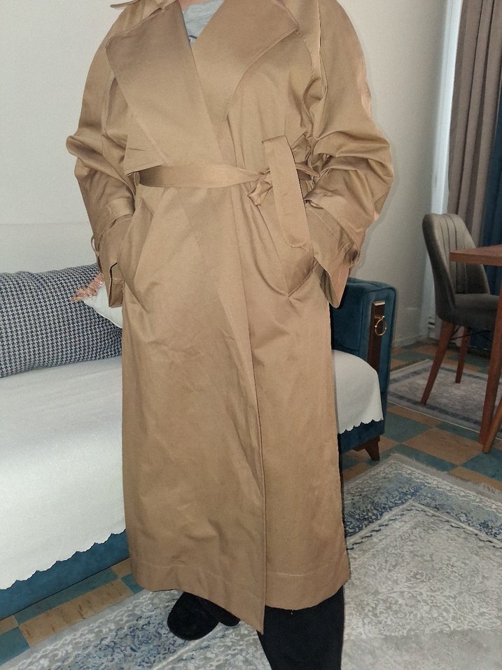 Bej renkli, kuşaklı ve uzun kollu trençkot. Geniş kesim ve yakası açık, sentetik kumaştan üretilmiştir. Günlük rahat sokak stili için uygundur.