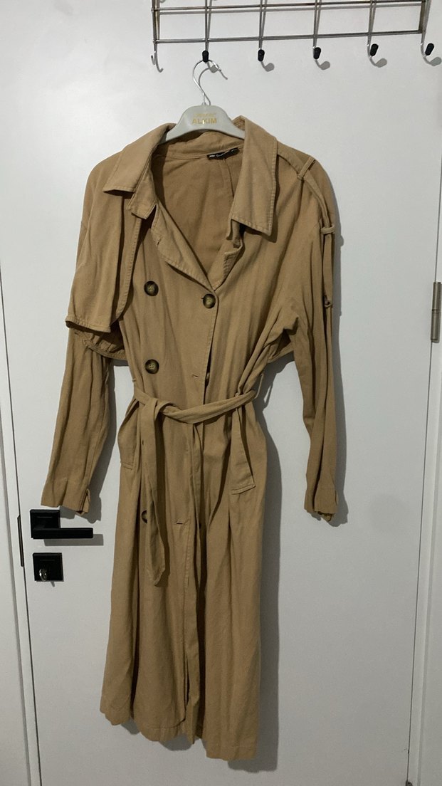 Bej renkte, keten kumaştan uzun ve kuşaklı kadın trençkotu. Notlu yaka ve askılı kollarıyla rahat, Paris sokak modasına uygun stil sunar. Günlük kullanım için ideal.