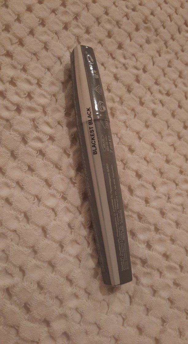 Bej ve gri kutusunda, siyah renkli maskara. Kirpikleri dolgun ve belirgin gösterir.