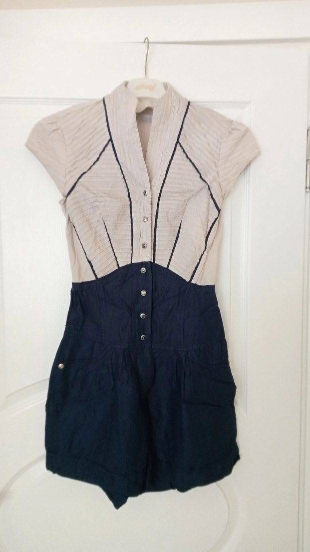 Kısa kollu, V yaka ve düğmeli, keten kumaştan yapılmış bej-lacivert şort tulum. Bohem ve Paris tarzı uyumlu. iki koltuk arası göğüs 40 bel 35 boy 84 cm