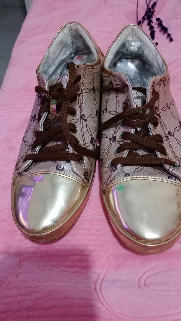 Bej lameli bağcıklı kadın ayakkabi