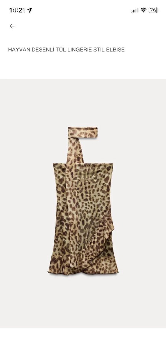 Leopar desenli, bej renkte ve boyun askılı elbise .