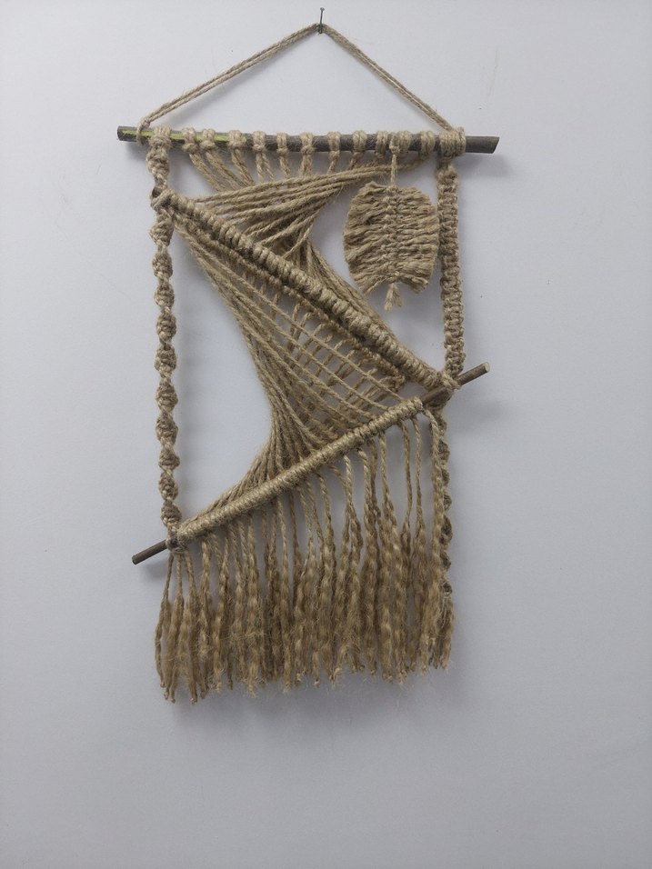 Gri tonlarda doğal iplik dokusuyla bej makrome duvar süsü, karmaşık düğüm desenlerine sahiptir. Rustik bir hava katar.