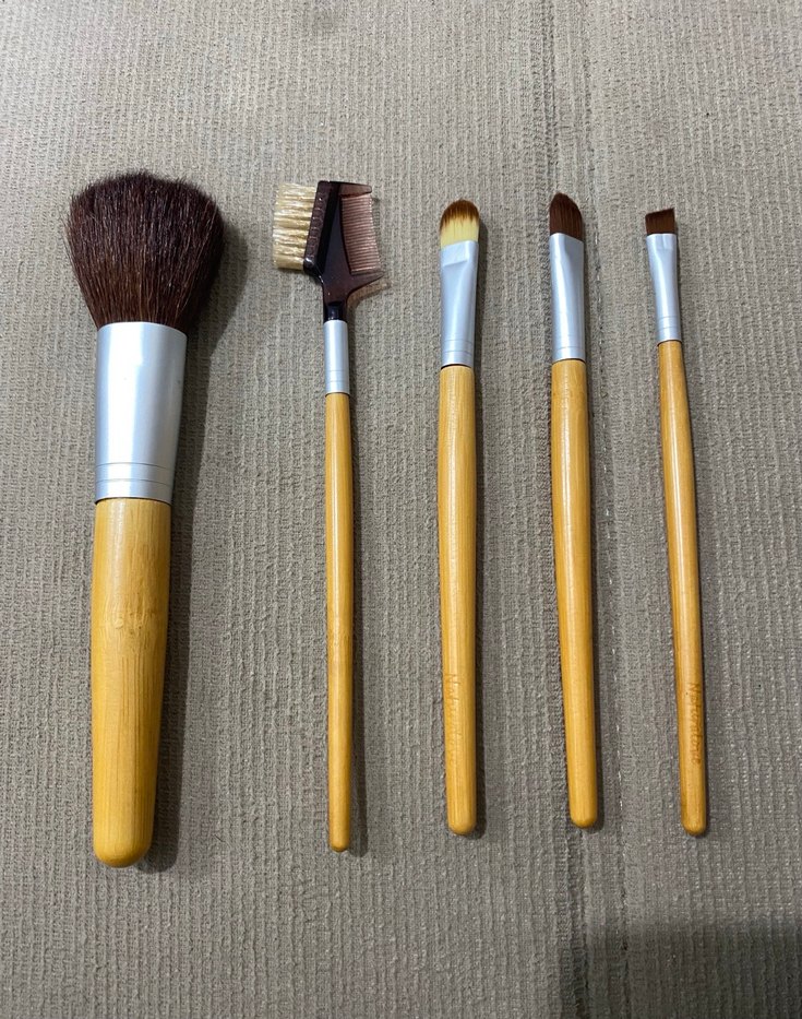 Bej renkte, ahşap saplı ve yumuşak kıllı 5 parçadan oluşan makyaj fırça seti.