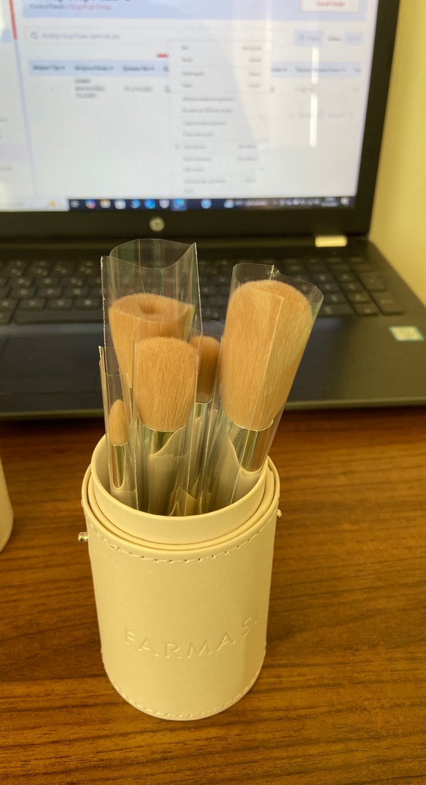 Yumuşak kıllara sahip açık bej makyaj fırçalarından oluşan set, bej tutucuda saklanır. Makyaj uygulamak için uygundur. ️
