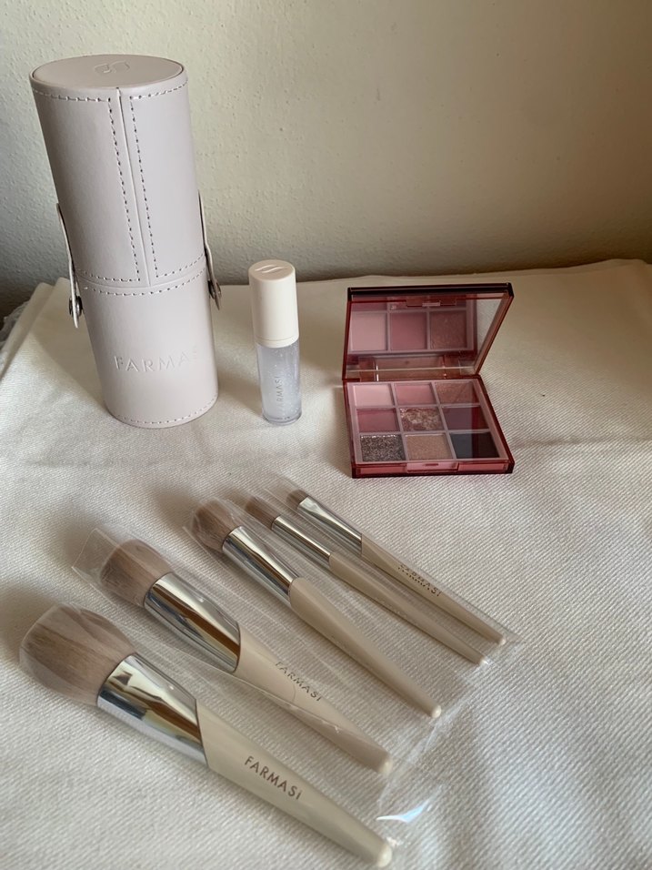 Bej renkte, gümüş detaylı beş adet makyaj fırçası ve silindirik kutu. Küçük sprey şişesi ve göz farı paleti ile birlikte.