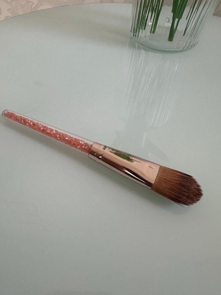 Işıltılı kristallerle dolu sapı ve yumuşak kılları olan bej makyaj fırçası.