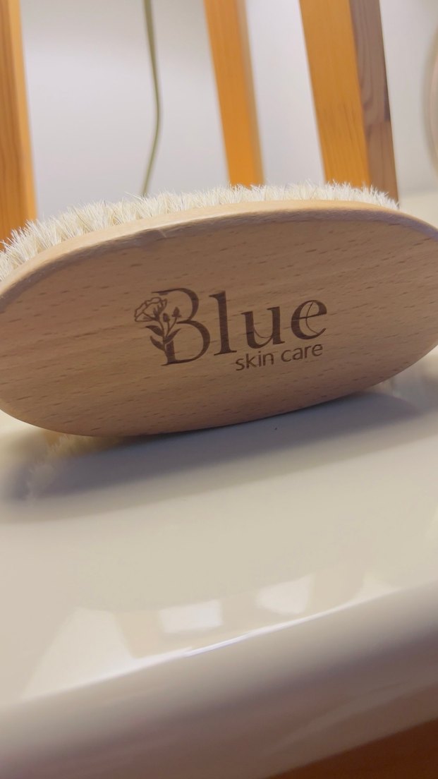 Blue Skin Care markalı, yumuşak kıllara sahip bej makyaj fırçası. Pürüzsüz uygulama sağlar. ️