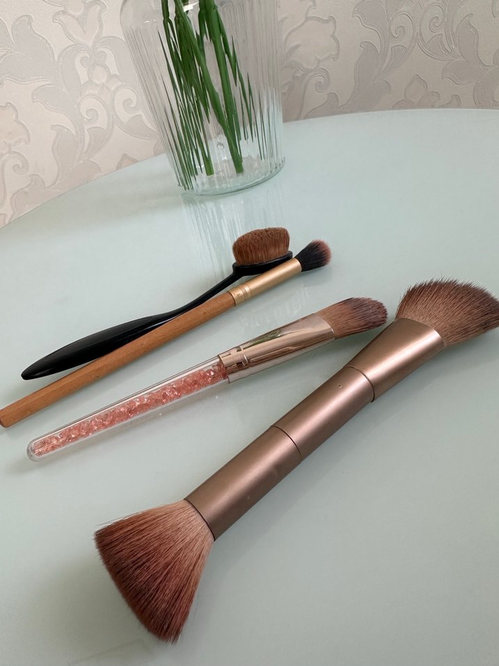 Yumuşak kıllara sahip, farklı sap tasarımlı bej makyaj fırçası seti. Toplu satış Az kullanılmıştır