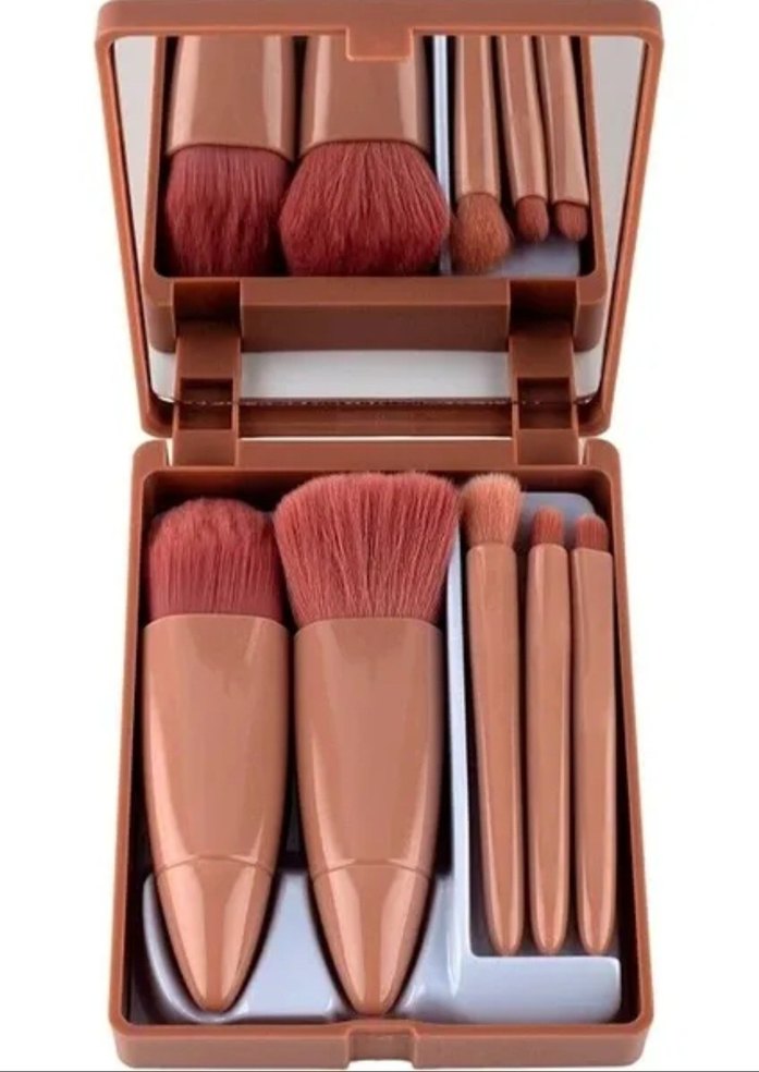 Yumuşak kıllı bej makyaj fırçası seti, aynalı kompakt kutuda birden fazla fırça içerir. Detaylı makyaj için uygundur. ️