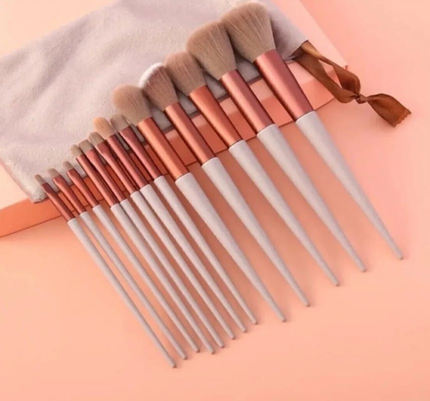 Çeşitli makyaj uygulamaları için yumuşak kıllı, açık renk saplı bej makyaj fırçası seti.