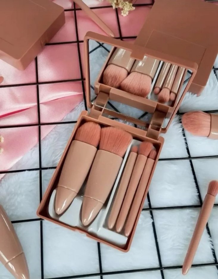 Yumuşak kıllara sahip bej makyaj fırçaları, aynalı kompakt kutuda düzenli şekilde sunulmuştur. ️