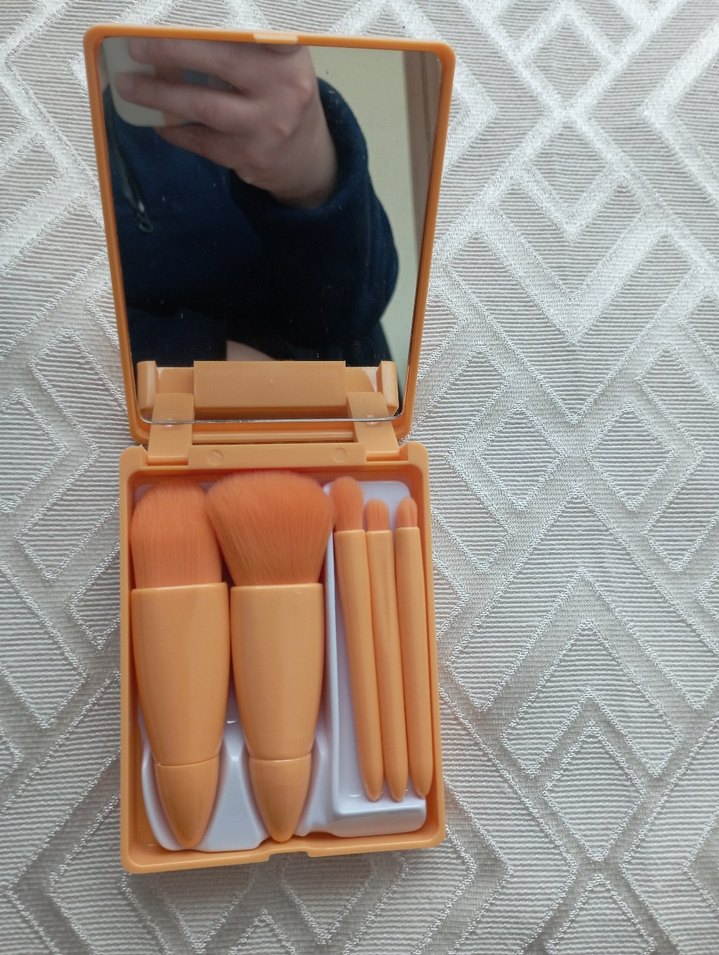 Bej renkte, farklı boyutlarda beş yumuşak kıllı makyaj fırçası, aynalı kompakt bir kutuda düzenli şekilde yer alıyor. kullanılmadı.