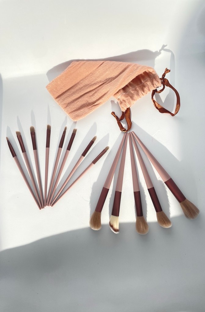 Çeşitli yumuşak kıllı makyaj fırçaları içeren bej renk set, kullanışlı ipli taşıma çantasıyla birlikte gelir. ️