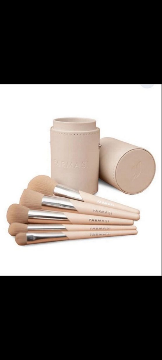 Yumuşak kıllara sahip bej makyaj fırçaları seti ve taşınabilir silindirik kutusu ile kolay saklama sağlar. ️
