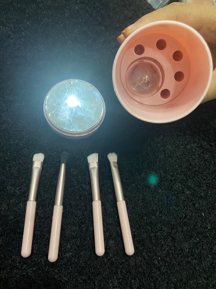 Dört farklı fırçadan oluşan bej makyaj fırçası seti ve kolay saklama için pembe tutucu içerir. ️aynasında kırık mevcuttur