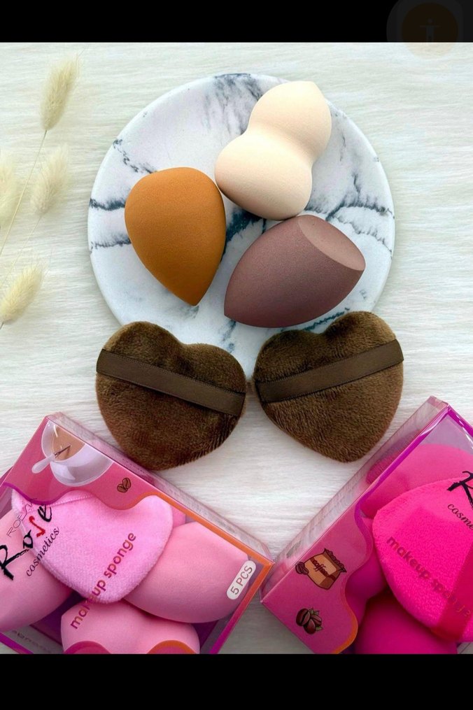Bej, kahverengi ve açık renklerde çeşitli şekillerde makyaj süngerleri ile kalp şeklinde kahverengi aplikatörler içeren set. Pürüzsüz makyaj için uygun.