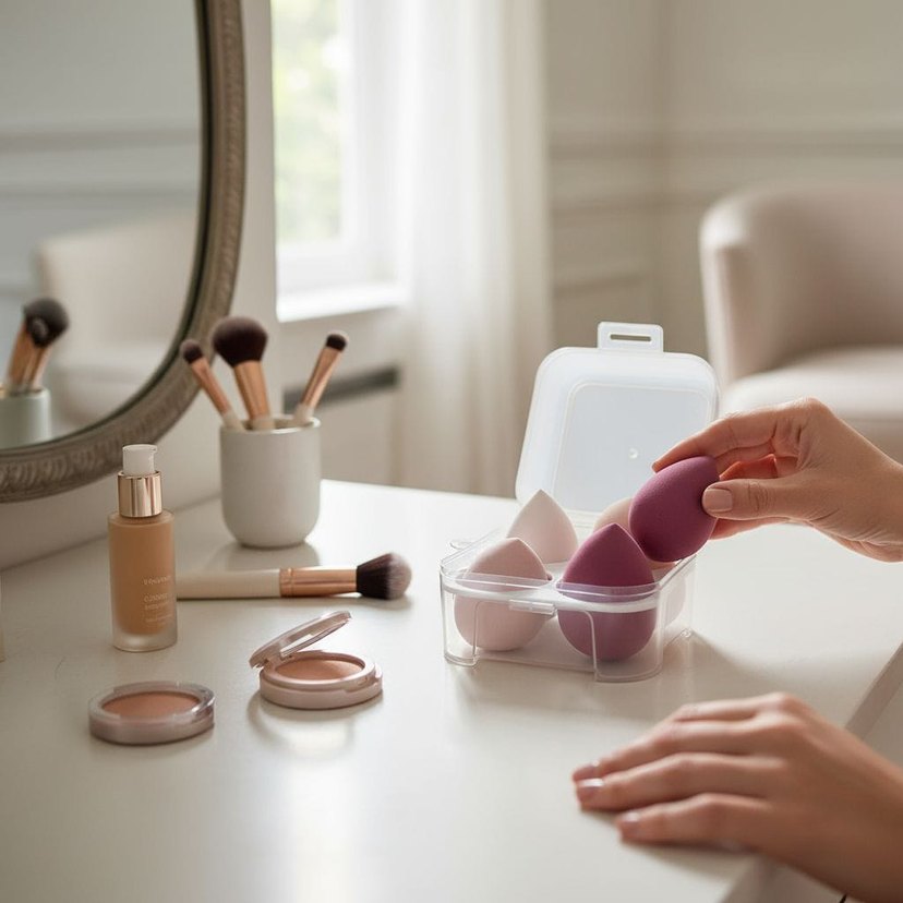 Pürüzsüz ve eşit fondöten uygulaması için açık bej tonlarında makyaj süngerleri seti. Şeffaf kutuda saklama kolaylığı sağlar.
