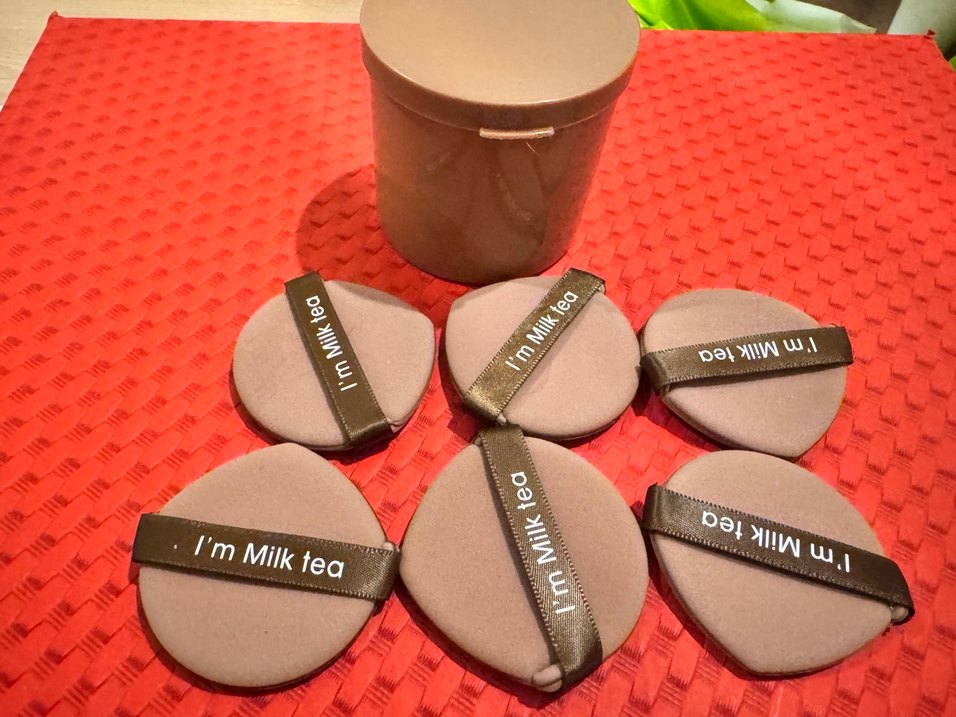 Üzerinde 'I'm Milk Tea' yazılı koyu kahverengi bantlı bej makyaj süngerleri ve yuvarlak bej kutu seti.