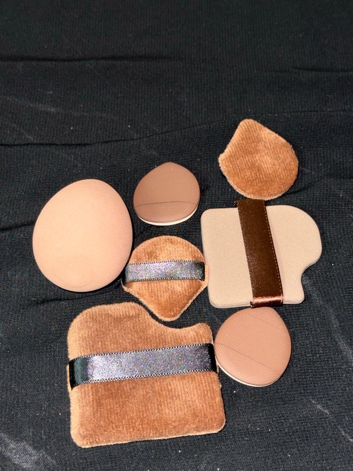 Çeşitli şekillerde ve kumaş bantlı, kolay tutuşlu bej makyaj süngeri ve uygulama pedleri seti. Pürüzsüz makyaj için uygundur.