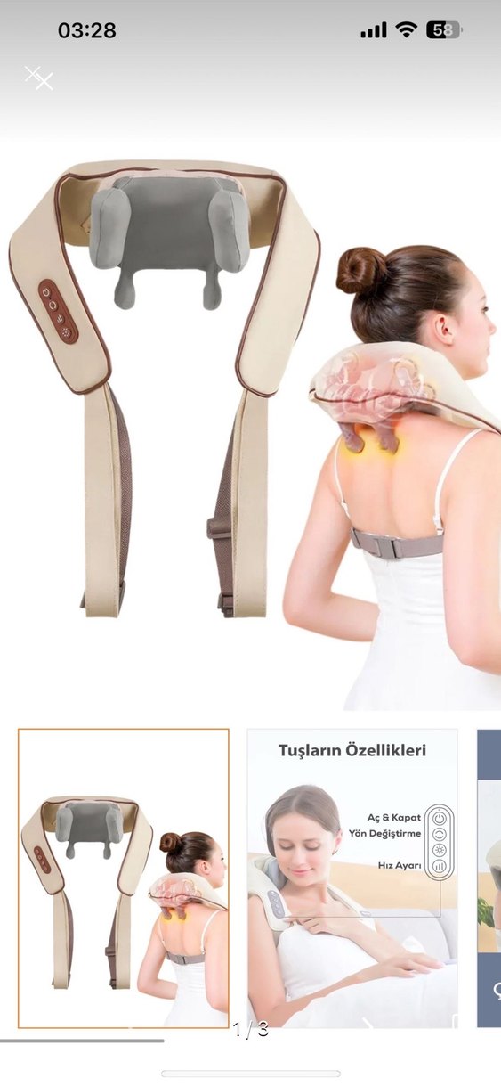 Bej renkli boyun ve omuz masaj aleti, açma-kapama, yön değiştirme ve hız ayarı tuşlarına sahiptir. Rahat oturur, kas gevşetir. ♀️