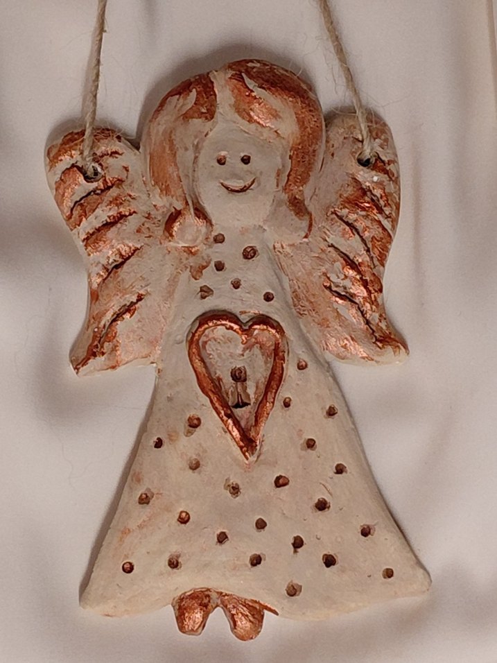 Kalp ve kanat detaylı, hafif bej renkli lız ve erkek melek figür süsleme, asmalı rustik görünümde.