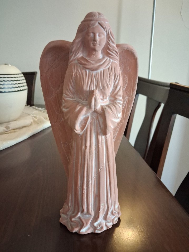 Amerika'dan alınma Kore malı dua eden,kanatlara ve akışkan giysilere sahip açık bej kumtaşından yspışmış Melek Heykeli. Boy 29 cm,en 11 cm dir.