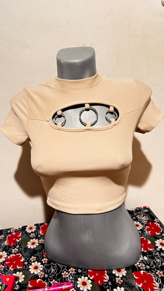 Bej renkli, likralı kumaştan yapılmış, kısa kollu ve bisiklet yaka, ön kısmında kesik detaylı, dar kesim crop top. Sokak modasına uygun.