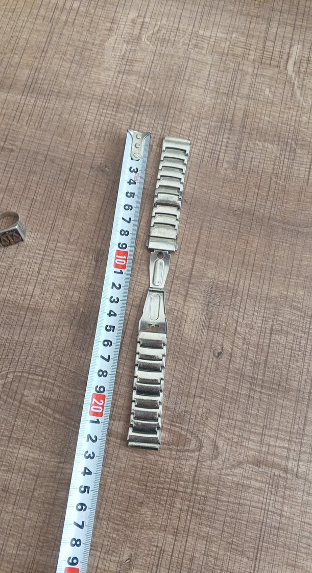 Yaklaşık 20 cm uzunluğunda, minimal tasarımlı bej metal erkek saat kayışı. Klasik toka ile kapanır, sade ve eski tarz görünümlü. ⌚