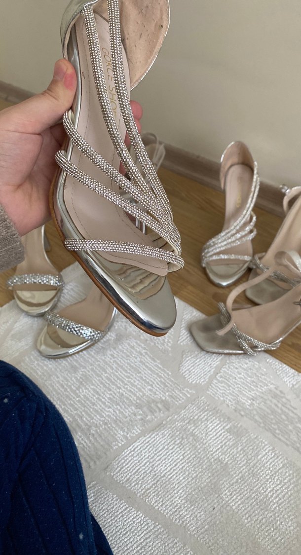 Bej metal stiletto topuklu ayakkabılar, taşlı ince bantlarıyla düğün ve özel günler için şık bir görünüm sunar. Yılan derisi desenli detaylar modern bir hava katıyor. Toplu alırsanız yardımcı olurum çok şik ayakkabılar